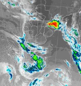 En la foto de satélite, se destacan importantes tormentas sobre Rio Grande do Sul, las cuales marginalmente alcanzan zonas del este de Corrientes, donde ya se concretaron algunas precipitaciones previamente. El pasaje de este frente, dejo lluvias copiosas en el este entrerriano, pero poco productivas para la franja del oeste entrerriano, SF y CB. Tampoco tuvo grandes aportes para el resto de la Mesopotamia o el NEA. Como se puede observar en la imagen, una nueva perturbación esta sobre la puertas del sudoeste de la región pampeana. El brazo de este frente provocará una progresiva inestabilidad, sobre todo en el este de la región pampeana entre hoy y mañana.