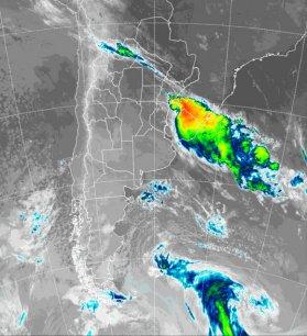 En la foto de satélite, se aprecia una posición estacionaria del sistema frontal. Luego del avance vertiginoso que el mismo tuvo durante la madrugada del miércoles, el mismo se estacionó en una diagonal que va desde el NOA hasta el sur de Brasil, con el mayor nivel de actividad sobre esta zona y Uruguay, tomando marginalmente el centro este de la Mesopotamia y proyectando inestabilidad al resto del área, pero sin promover desarrollos nubosos destacados. Algunas lluvias menores se reportan desde el norte de Salta y Jujuy.