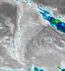 En la foto de satélite, se observan algunas coberturas de nubes bajas sobre sectores de las provincias del centro, nada de importancia. Las mismas se dan por la mezcla de aire frío con algunos restos de humedad en capas bajas, pero no son significativas como para provocar precipitaciones. Sólo sobre el extremo norte de la Mesopotamia, podrían volver a darse algunas lluvias. En forma independiente, también podrían darse precipitaciones débiles y algunas nevadas en los andes patagónicos.