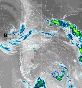 En la foto de satélite, se aprecia al este de Malvinas una zona de baja presión que ha generado una eficiente vía de transporte del aire de origen polar hacia la Patagonia. En la zona de Puerto Madryn, se han registrado nueve grados por debajo de cero, lo cual posiblemente haya sido generalizado en gran parte del resto de Chubut y Santa Cruz. Otro sistema de baja presión, se ubica frente a las costas del centro de Chile. El mismo provocará importante actividad sobre la cordillera cuyana y sobre el noroeste de la Patagonia, donde se esperan importantes nevadas. Algunos restos de nubosidad prevalecen sobre el noreste de la Mesopotamia, sector que puede recibir algunas lluvias modestas y dispersas.