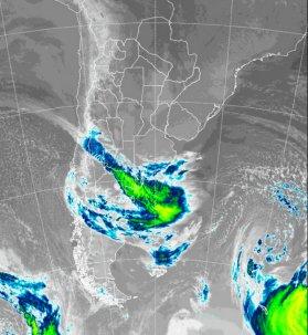 En la foto de satélite, podemos ver las coberturas nubosas que se forman en la superficie de separación entre las dos masas de aire, las misma ya avanzan sobre los partidos costeros del sur de BA. Esta zona frontal se presenta más activa y con algún potencial de lluvias el este de la provincia de RN. Sobre el centro norte del país, sólo se presentan algunas nubes bajas temporarias en áreas del NEA.