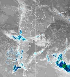 En la foto de satélite, no se distinguen perturbaciones de importancia transitando el área continental del país. Un débil sistema frontal ingresa por el oeste sobre las provincias Patagónicas, llevando frío pero poca actividad pluvial. También la región cuyana y NQ, reciben nubes que ingresan desde el Pacífico, en este caso con potenciales nevadas sobre la cordillera. Esta perturbación se proyecta hacia el este, afectando con nubes bajas el sur bonaerense, sin que se esperen precipitaciones.