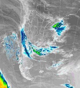 En la foto de satélite se marcan las coberturas nubosas que se ven favorecidas por la interacción de masas de aire. De alguna manera este frente define el sector hasta donde logró avanzar el aire más cálido. El proceso se irá revirtiendo a partir de hoy y la zona frontal encontrará impulso en el desarrollo de una zona de baja presión para avanzar hacia el noreste. La nubosidad actual puede dejar nevadas en la zona cordillerana del centro del país y algunas lluvias en el noreste de la Patagonia.