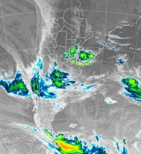 En la foto de satélite se destaca el avance de una zona frontal desde el noroeste de la Patagonia hacia el sudoeste de la región pampeana. Por otro lado, en forma independiente y dentro del núcleo más húmedo de la masa de aire que domina el centro del país, comienzan a desarrollarse nubes que tienen potencial pluvial. Los modelos de pronóstico no anticipan lluvias de importancia, pero es posible que en áreas reducidas del centro este se concreten tormentas importantes.