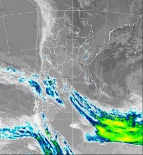 En la foto de satélite, no se aprecian coberturas de importancia en la región pampeana. Dos perturbaciones transitan la Patagonia, una afectando el extremo sur, con lluvias débiles que se reportan desde TdF y otra sobre el norte, con algunas nevadas menores que se están generando en el oeste de Neuquén y RN. Esta perturbación se ira desplazando hacia el este, tomando con nubosidad sectores del sur de la región pampeana, sin que estén previstas precipitaciones asociadas a este movimiento.