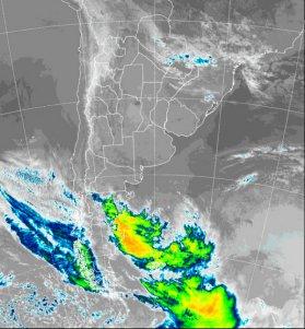 En la foto de satélite se aprecian perturbaciones que ingresan desde el Pacifico sur sobre la Patagonia. Como en otras ocasiones, la zona de alta presión sobre el continente, evita el avance de estas ondas hacia el norte, cancelando la formación de zonas frontales sobre el centro del país. La actividad se está concentrando en el este de la estepa de Chubut y SC, aunque una segunda onda está promoviendo lluvias menores en la cordillera del sudoeste de SC y avanzará sobre TdF. En tanto sobre el centro norte del país, prevalecen los cielos despejados.