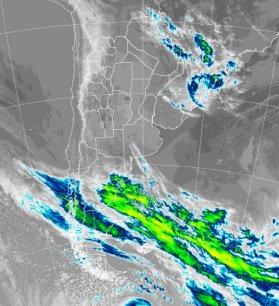 En la foto de satélite se aprecian algunas nubes en el norte de la Mesopotamia, pero se destaca el vasto despliegue de cielos despejados. El gris más claro evidencia el avance de aire frío por la franja mediterránea hasta el norte del país. La Patagonia continua afectada por un tránsito más continuo de perturbaciones, con el este de la meseta expuesta a algunas precipitaciones menores y alginas nevadas que pueden darse sobre la cordillera de transición entre Chubut y SC.