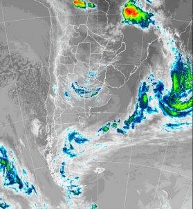 En la foto de satélite, se destaca el avance hacia el sur del sistema de baja presión que genero las lluvias del domingo y que ahora afecta el este de Chubut y SC, donde pueden concretarse algunas tormentas. El brazo frontal ya está todo por fuera del territorio nacional. Por otra parte, se nota el aumento de coberturas sobre la franja central del país, que provoca el avance de la perturbación secundaria.