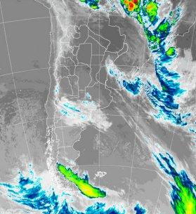 En la foto de satélite, se aprecia sobre el norte de la Patagonia, ya avanzando sobre el sudoeste de la región pampeana, un vasto despliegue de nubes bajas. Esta nubosidad no puede promover el desarrollo de sistemas precipitantes de importancia, aunque a lo largo del día podría observarse algo de desarrollo en el sudoeste y reflejarse en algunos chaparrones zonales de mayor importancia. Sobre el centro este de la Mesopotamia aparecen los restos del sistema frontal previo, mientras que en el extremo sur de la Patagonia, se mantiene el tránsito de perturbaciones incluso con algunas nevadas en la provincia de TdF.