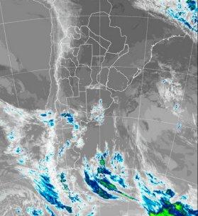 En la foto de satélite no se destacan nubes de importancia a gran escala. En el extremo sur de la Patagonia, la situación es más inestable, donde desde hace varias jornadas se nota una continua sucesión de perturbaciones que provocan lluvias débiles que alternan con mejoramientos temporarios. Algo de nubosidad se presenta en el sudoeste de BA, mientras que sobre el sudeste las densas nieblas, por sectores lloviznas, impiden ver el cielo. En el resto del país prevalecen cielos despejados o con alguna cobertura parcial. La escala de los grises de sur a norte, denota el posicionamiento de distintas masas de aire caracterizadas por su temperatura.