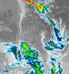 En la foto de satélite, se aprecia el desplegué completo de la onda frontal que afecto la región pampeana en las últimas jornadas. La baja presión se ubica frente a las costas del sudeste de BA, mientras que el brazo del frente alcanza hasta el norte de Bolivia, con áreas donde se aprecian importantes desarrollos nubosos. Por detrás dominan los cielos despejados y las condiciones de estabilidad, con un descenso moderado de las temperaturas y vientos del oeste sudoeste.