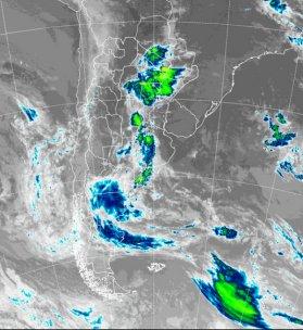 En la imagen de satélite, se destacan las coberturas que afectan al NEA, pero también notamos el paso de una perturbación menor que avanza por el sur de la región pampeana hacia el este, donde la situación en general es más estable. Las coberturas nubosas también son generalizadas en el centro norte de la Patagonia, pero con bajo potencial pluvial.