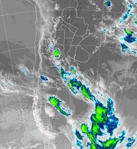 En la foto de satélite, se nota la nubosidad que provoca la inestabilidad de la línea frontal. Se destacan algunas tormentas en el centro oeste de la provincia de CB y otras ubicadas sobre el sudoeste bonaerense, donde ha venido lloviendo en las últimas jornadas, en forma modesta pero con mayor continuidad. Como vemos la deformación que genera la zona de alta presión fuerza a las tormentas a moverse sobre el sur bonaerense, lo cual puede terminar beneficiando a esta zona entre hoy y mañana. En el resto de la franja oeste del país, la nubosidad no presenta significancia, mientras que sobre el este prevalecen los cielos despejados. Otra perturbación independiente, afecta sectores de la Patagonia.