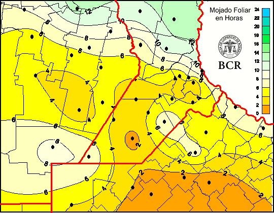 Mapa de cantidad de horas de mojado foliar en las últimas 24 horas.