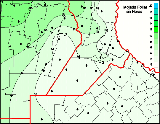 Mapa de humedad de hoja de las las últimas 0 horas.(Desde las 8:00AM hasta las 8:00AM). Se actualiza a las 10:00hs.