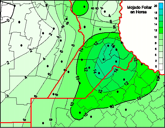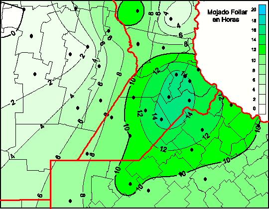 Mapa de humedad de hoja de las las últimas 48 horas.(Desde las 8:00AM hasta las 8:00AM). Se actualiza a las 10:00hs.