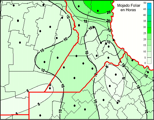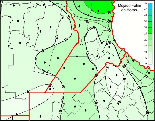 Mapa de cantidad de horas de mojado foliar en las últimas 24 horas.