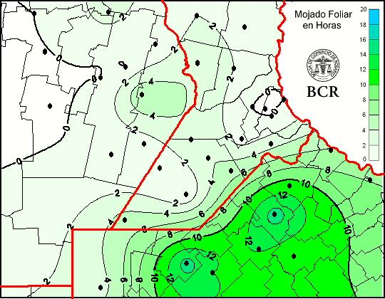 Mapa de cantidad de horas de mojado foliar en las últimas 24 horas.