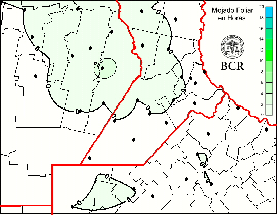 Mapa de cantidad de horas de mojado foliar en las últimas 24 horas.