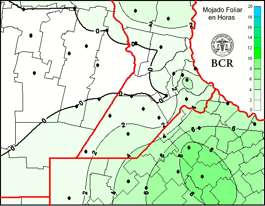 Mapa de cantidad de horas de mojado foliar en las últimas 24 horas.