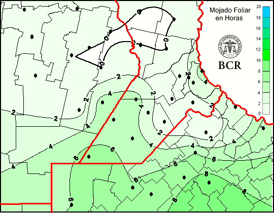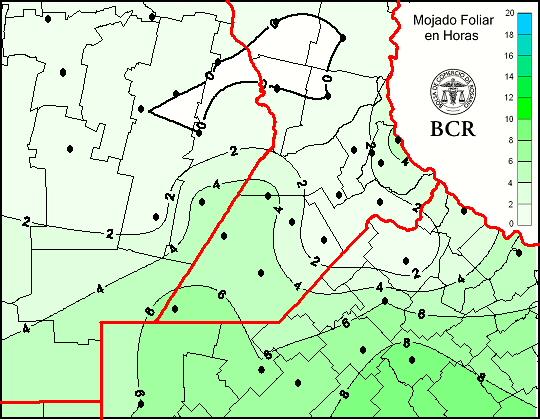Mapa de cantidad de horas de mojado foliar en las últimas 24 horas.