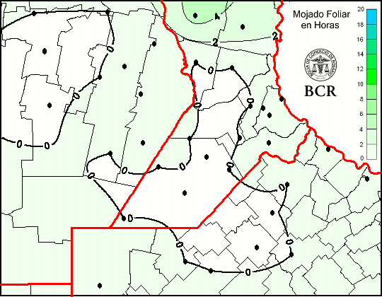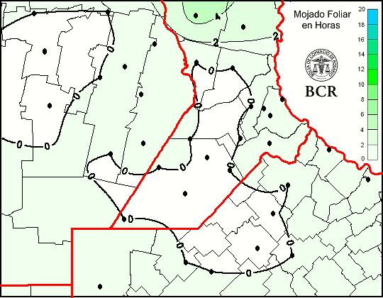 Mapa de cantidad de horas de mojado foliar en las últimas 24 horas.