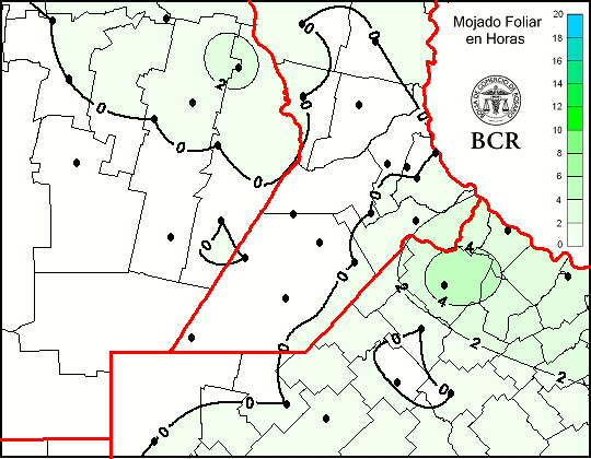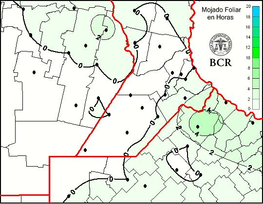 Mapa de cantidad de horas de mojado foliar en las últimas 24 horas.