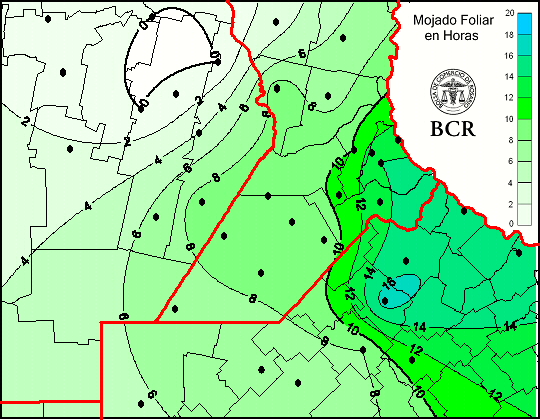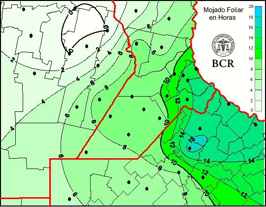Mapa de cantidad de horas de mojado foliar en las últimas 24 horas.