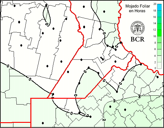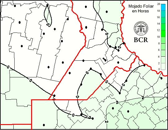 Mapa de cantidad de horas de mojado foliar en las últimas 24 horas.