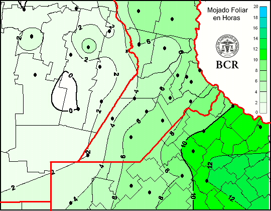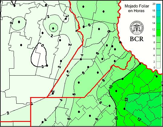 Mapa de cantidad de horas de mojado foliar en las últimas 24 horas.