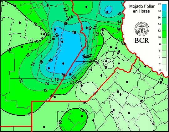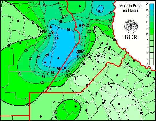 Mapa de cantidad de horas de mojado foliar en las últimas 24 horas.