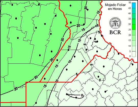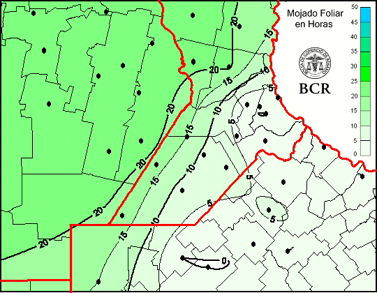 Mapa de cantidad de horas de mojado foliar en las últimas 24 horas.