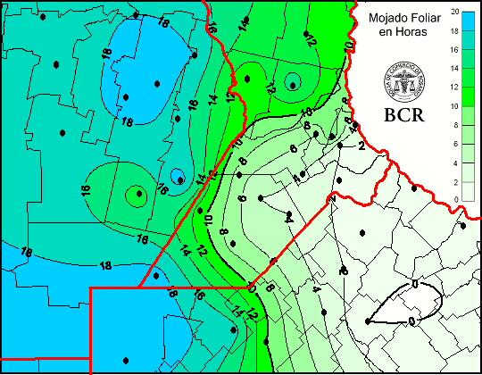 Mapa de cantidad de horas de mojado foliar en las últimas 24 horas.