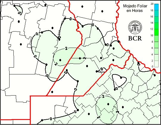 Mapa de cantidad de horas de mojado foliar en las últimas 24 horas.