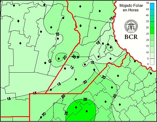 Mapa de cantidad de horas de mojado foliar en las últimas 24 horas.