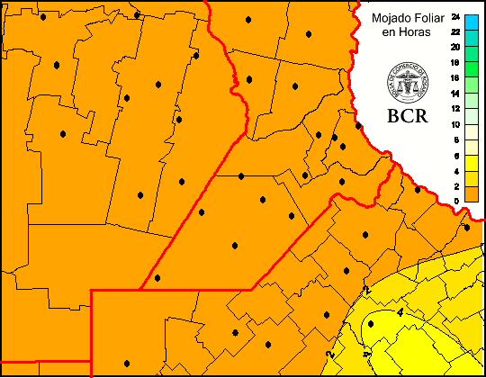Mapa de cantidad de horas de mojado foliar en las últimas 24 horas.