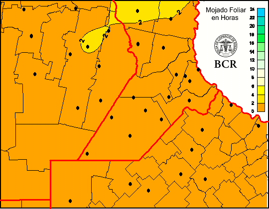 Mapa de cantidad de horas de mojado foliar en las últimas 24 horas.