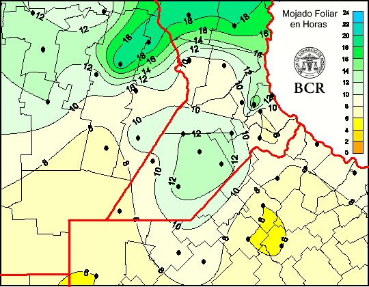Mapa de cantidad de horas de mojado foliar en las últimas 24 horas.