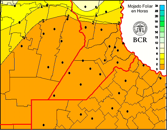 Mapa de cantidad de horas de mojado foliar en las últimas 24 horas.