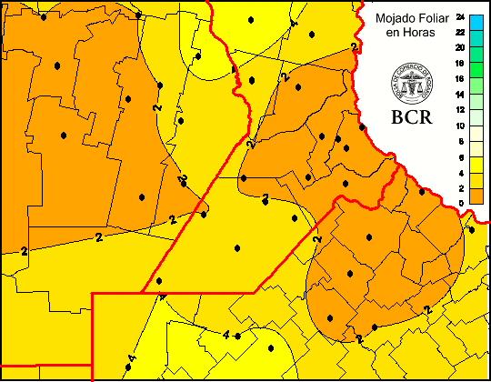 Mapa de cantidad de horas de mojado foliar en las últimas 24 horas.