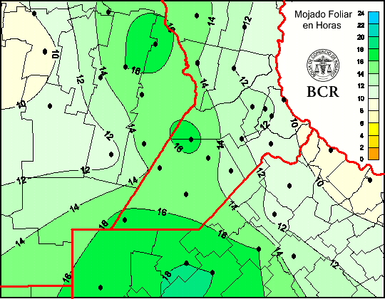 Mapa de cantidad de horas de mojado foliar en las últimas 24 horas.