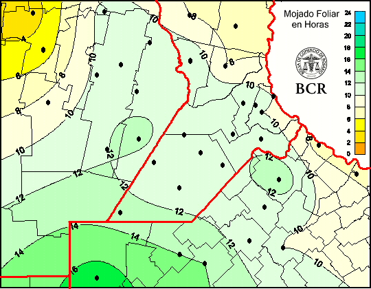 Mapa de cantidad de horas de mojado foliar en las últimas 24 horas.