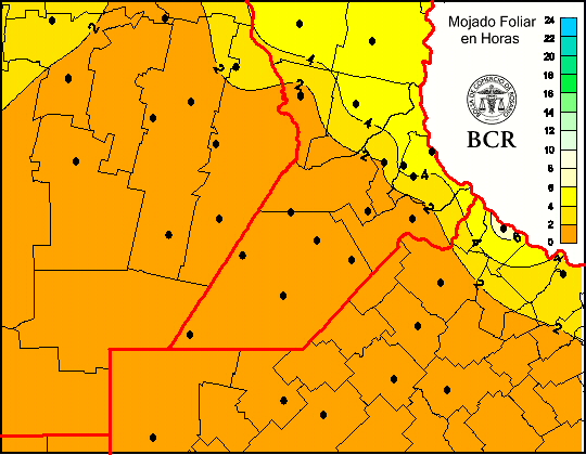 Mapa de cantidad de horas de mojado foliar en las últimas 24 horas.