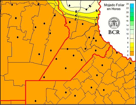 Mapa de cantidad de horas de mojado foliar en las últimas 24 horas.