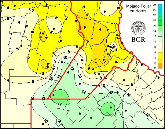 Mapa de cantidad de horas de mojado foliar en las últimas 24 horas.