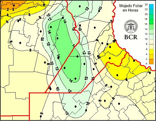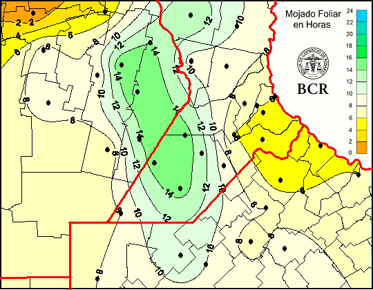 Mapa de cantidad de horas de mojado foliar en las últimas 24 horas.