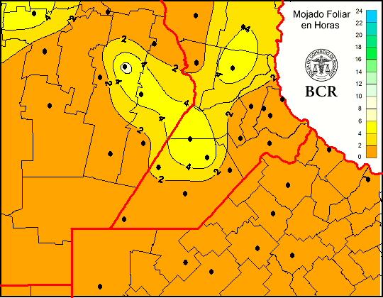 Mapa de cantidad de horas de mojado foliar en las últimas 24 horas.
