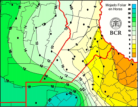 Mapa de cantidad de horas de mojado foliar en las últimas 24 horas.
