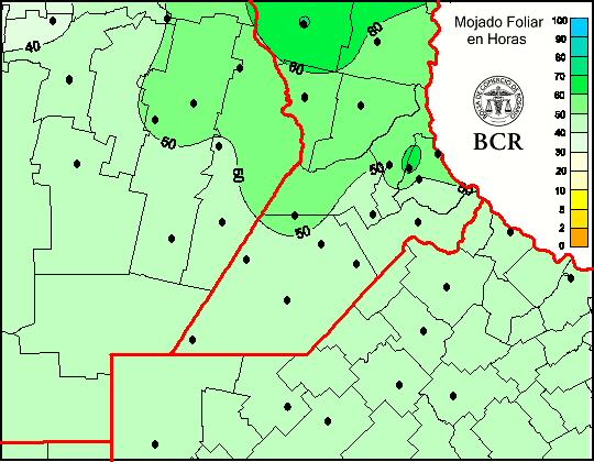Mapa de cantidad de horas de mojado foliar en las últimas 24 horas.