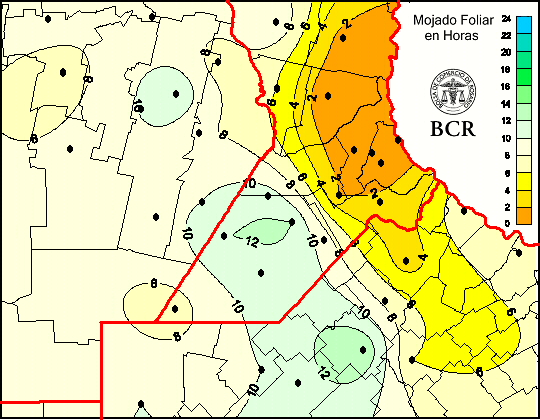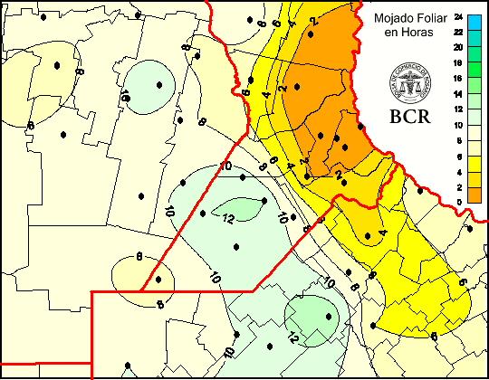 Mapa de cantidad de horas de mojado foliar en las últimas 24 horas.